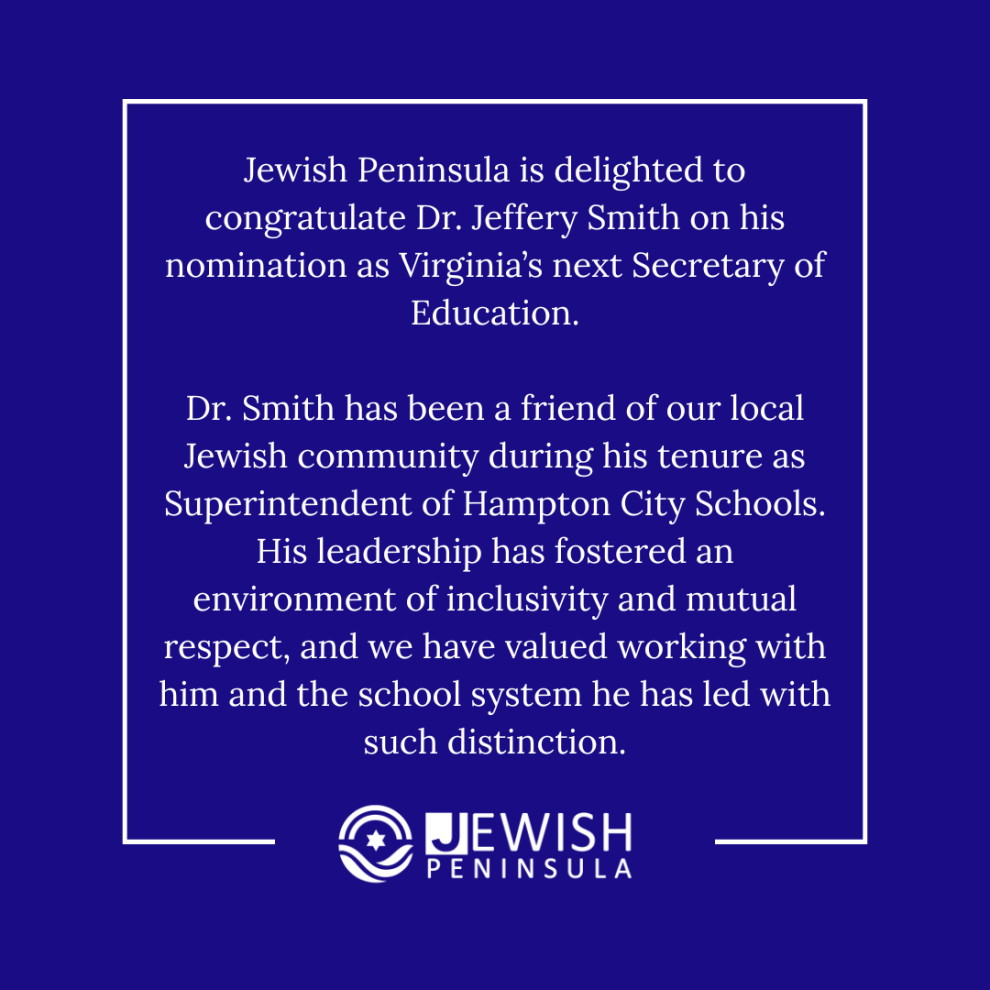 Jewish Peninsula is delighted to congratulate Dr. Jeffery Smith on his nomination as Virginia’s next Secretary of Education.
