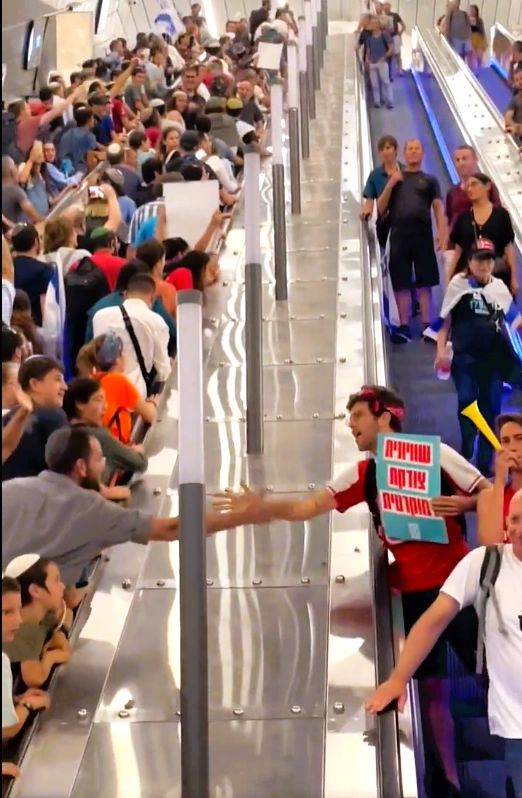 Those who had been at the massive anti-reform demonstration in Tel Aviv were descending the long escalators to the platforms, and those coming from the huge pro-reform rally in Jerusalem were ascending. Each side, adorned with Israeli flags and their own chants, entered the escalators headed in different directions. One group up. The other down.
